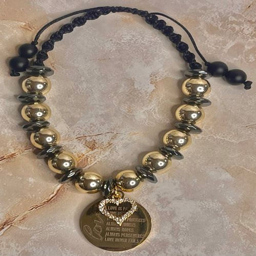 Black Onyx & Metallic Gold Hematite “Love” Gemstone Beaded Bracelet